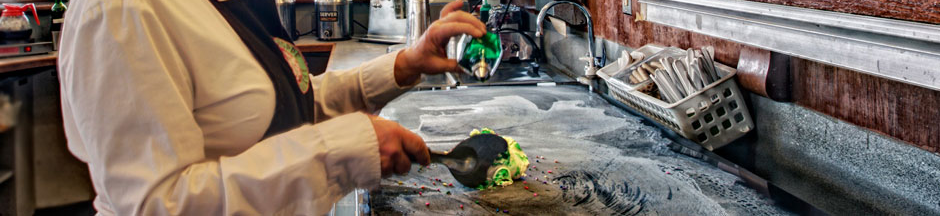 Many of you must be asking what exactly is a marble top creamery? It's a section of marble set on top of a frost top freezer to keep it cold. We add your custard and mix any flavor or topping combination to individually create your own custard flavor. Served in either a waffle cone, waffle bowl, cake cone or dish.